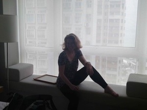 Mandy relaxing on the window seat at Traders Hotel, Hong Kong