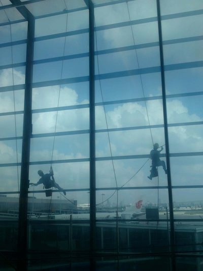 Low tech window cleaning at Shanghai Airport